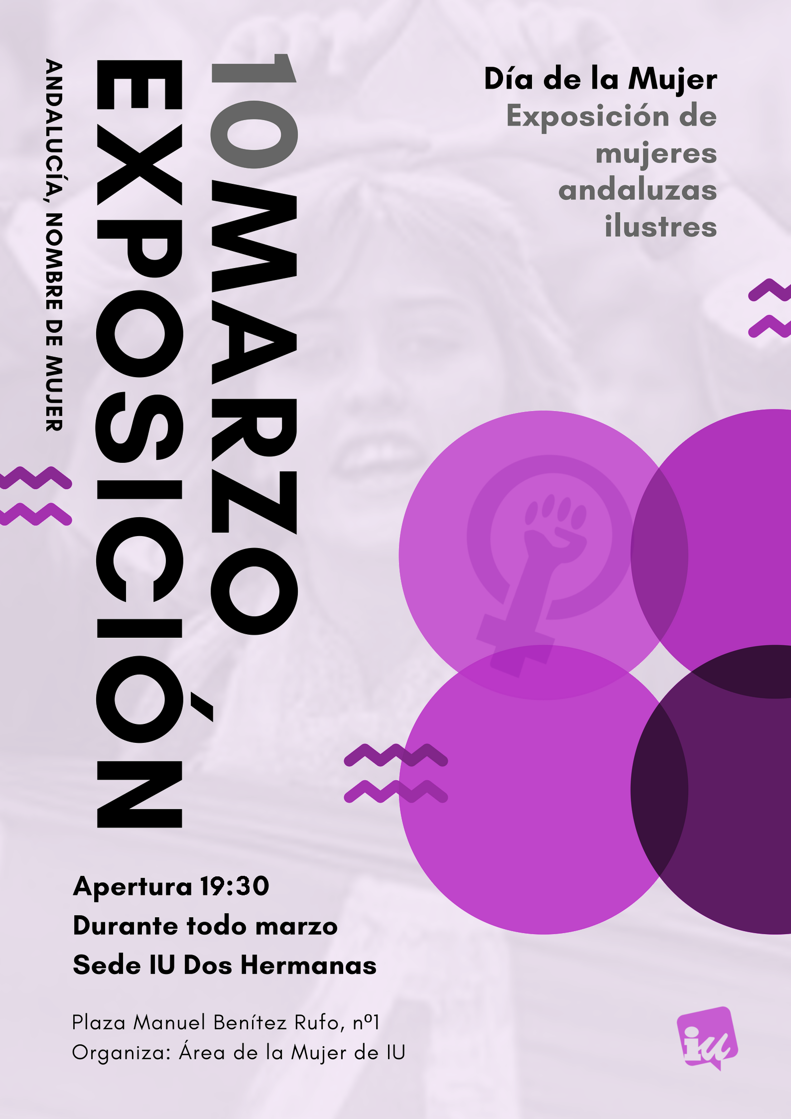 Izquierda Unida Dos Hermanas quiere conmemorar el Día Internacional de las Mujeres con una serie de actividades que se desarrollarán a lo largo del mes de marzo, y que se iniciarán hoy con la inauguración de la exposición “Andalucía, Nombre de Mujer”. Esta inauguración tendrá lugar a las 19,30 horas, en la sede local de IULV-CA, ubicada en la Plaza Alcalde Manuel Benítez Rufo, 1.