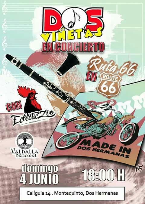 Según hemos podido conocer a través de un comunicado, la revista cómic nazarena Dos Viñetas ha organizado para mañana domingo, 4 de junio, a las 18 horas, un concierto en el que se mezclará música y arte en directo. Este concierto tendrá lugar en la sala Ruta 66, sita en calle Calígula 14, en el barrio de Montequinto, y en él, la reconocida banda Eclectic Zoo interpretará en directo, y al ritmo de swing, grandes clásicos de la música, como “Proud Mary”, de Creedence Clearwater Revival, “Walk on the Wild Side”, de Lou Reed o “Billie Jean”, de Michael Jackson, mientras que ocho dibujantes pertenecientes a Dos Viñetas (Ester Salguero, Ernesto Lovera, Mer Hidalgo, Manuel Colorado, José Antonio Sancho, Michael Cotton, Alfonso Tierra y Carlos Flores) dibujarán su visión de dichas canciones. La realización de estos dibujos “podrá seguirse en directo por las pantallas repartidas por el local”.