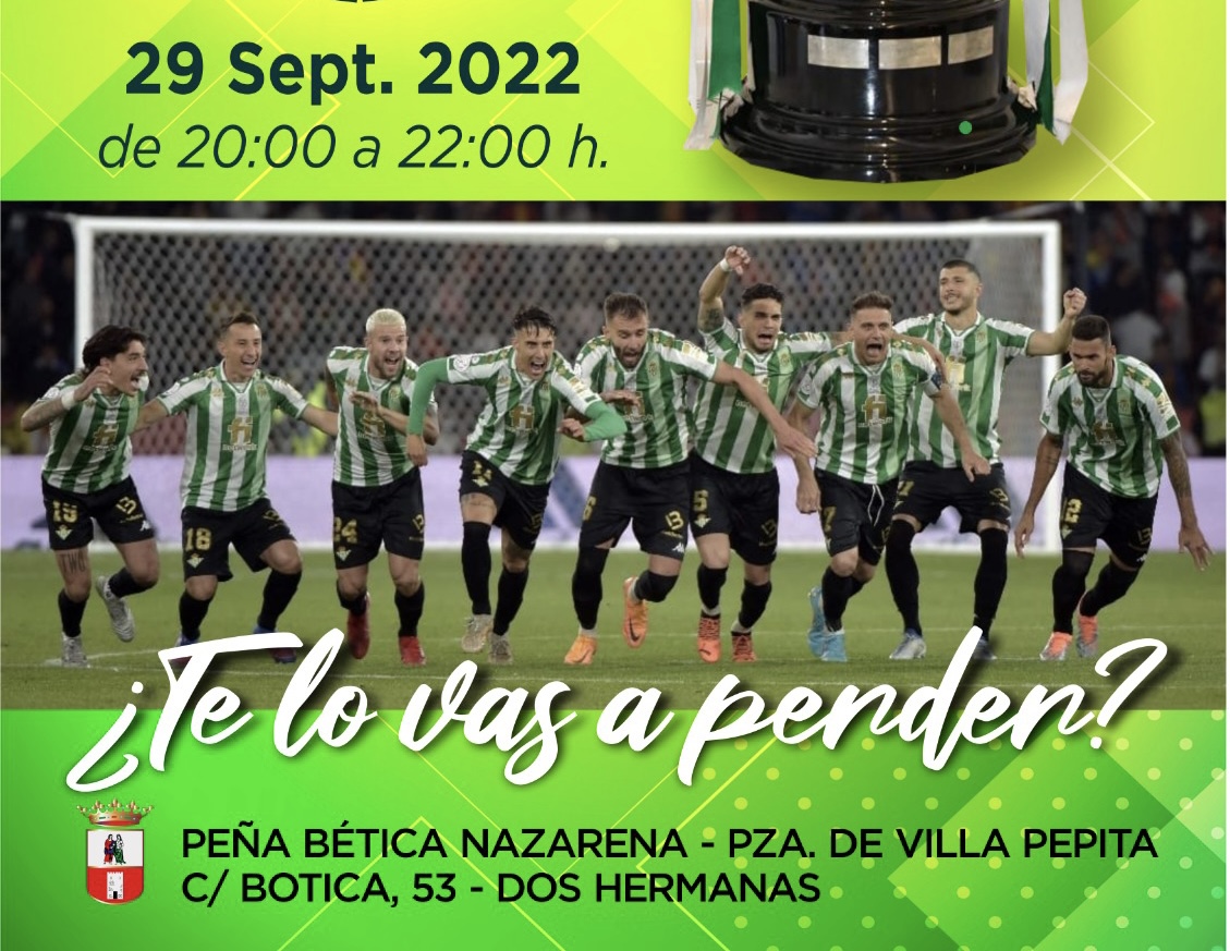 Debido a que el próximo día 26/09/2022 se celebra la XLI GALA NACIONAL DEL DEPORTE que tendrá lugar en nuestra ciudad, y a propuesta del Excmo. Ayuntamiento de Dos Hermanas y dando el visto bueno el Real Betis Balompié se ha procedido a posponer el evento de la presentación de la Copa de Su Majestad el Rey, en las instalaciones ubicada en la calle Botica. La nueva fecha establecida será el próximo jueves 29 de septiembre de 2022 (de 20 a 22 horas).