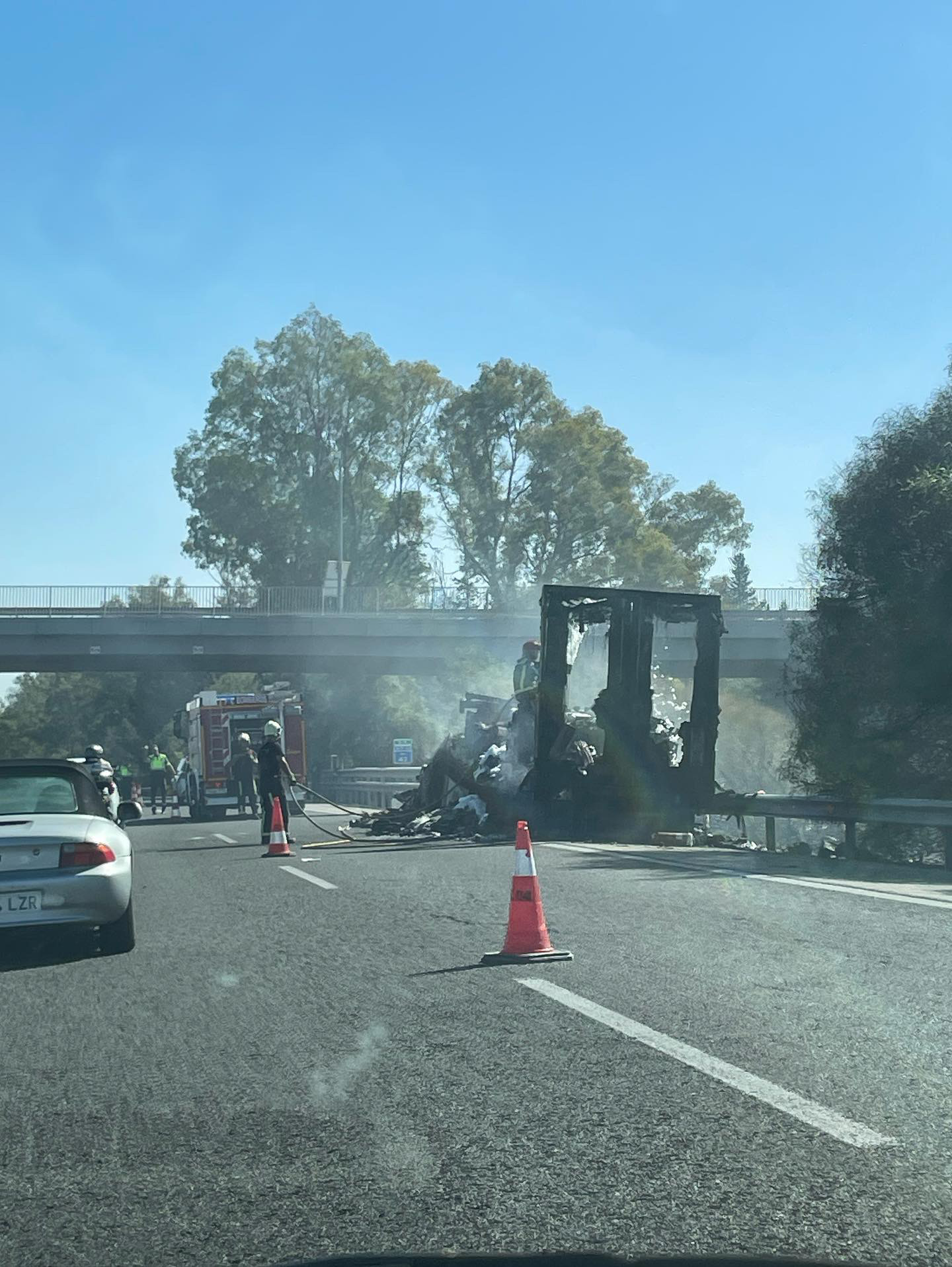 La Guardia Civil ha cortado el tráfico a la altura de Los palacios con temperaturas de hasta 44 grados. Sobre las 20:00 de la tarde se ha vuelto a restablecer el tráfico.