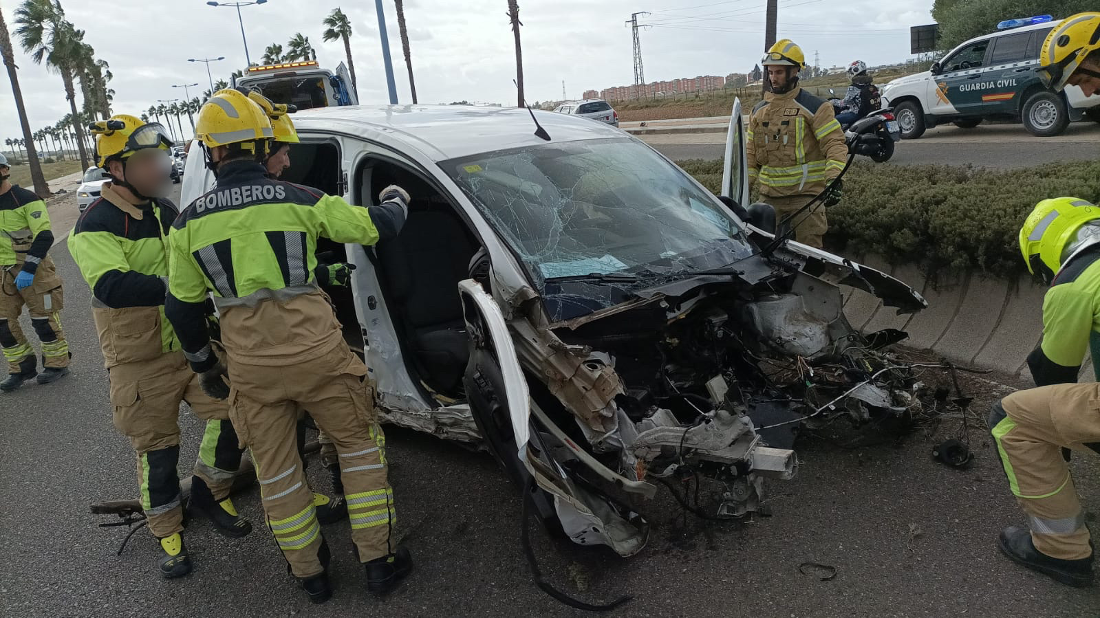 Una furgoneta por causas que no has trascendido golpeó con la mediana que separa ambos sentidos y chocó con varias palmeras. Al lugar de los hechos se desplazaron efectivos de policía local y bomberos. Finalmente la víctima, un varón de mediana edad no estaba atrapada por lo que no fue necesario el rescate pero si presentaba heridas de consideración. Finalmente fue trasladado por los efectivos sanitarios desplazados.