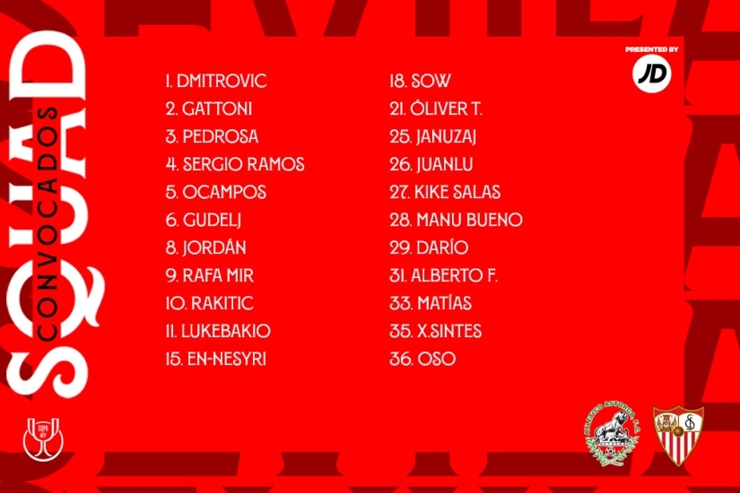 Dmitrovic, Alberto Fores, Matías, Juanlu, Darío, Gattoni, Sergio Ramos, Xavi Sintes, Kike Salas, Pedrosa, Oso, Gudelj, Joan Jordán, Manu Bueno, Sow, Rakitic, Óliver Torres, Januzaj, Ocampos, Lukebakio, Rafa Mir y En-Nesyri.