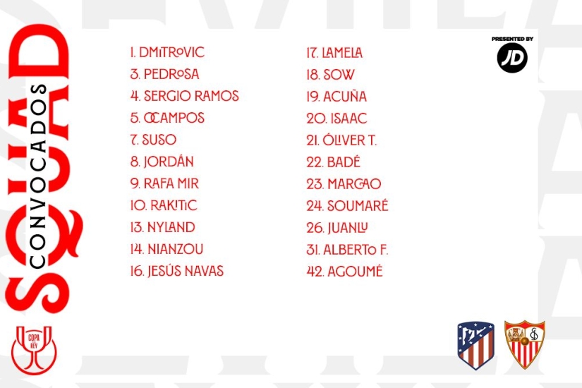 Dmitrovic, Nyland, Alberto Flores, Juanlu, Jesús Navas, Acuña, Pedrosa, Sergio Ramos, Badé, Nianzou, Marcao, Soumaré, Agoumé, Sow, Jordán, Rakitic, Óliver Torres, Suso, Ocampos, Lamela, Rafa Mir e Isaac.
