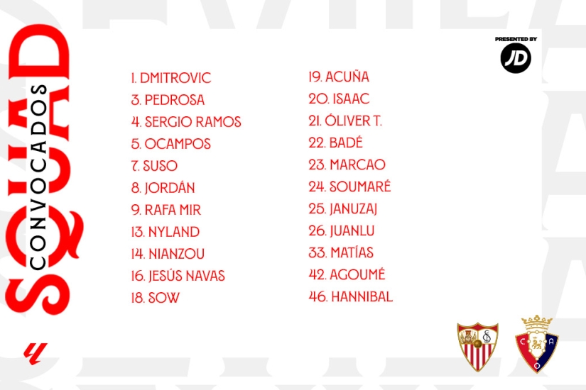 Nyland, Dmitrovic, Matías, Jesús Navas, Juanlu, Sergio Ramos, Badé, Marcao, Nianzou, Acuña, Pedrosa, Soumaré, Agoumé, Joan Jordán, Sow, Óliver Torres, Hannibal, Ocampos, Januzaj, Suso, Rafa Mir e Isaac Romero.