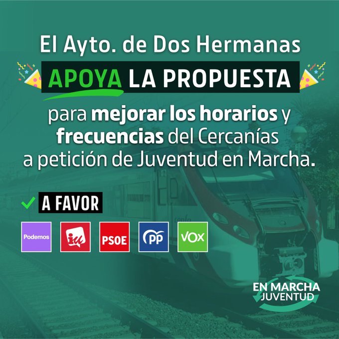 Esto ha sido posible tras la presentación por parte de Nerea Tovar, concejala de Podemos Dos Hermanas e integrante de Juventud en Marcha, de una moción en apoyo a la campaña de mejoras del Cercanías, moción que ha ido recibiendo el apoyo uno tras otro de todos los grupos que componen la Corporación Municipal. Un posicionamiento que aunque podrían esperarse, ha sido toda una alegría en el grupo de activistas juveniles.