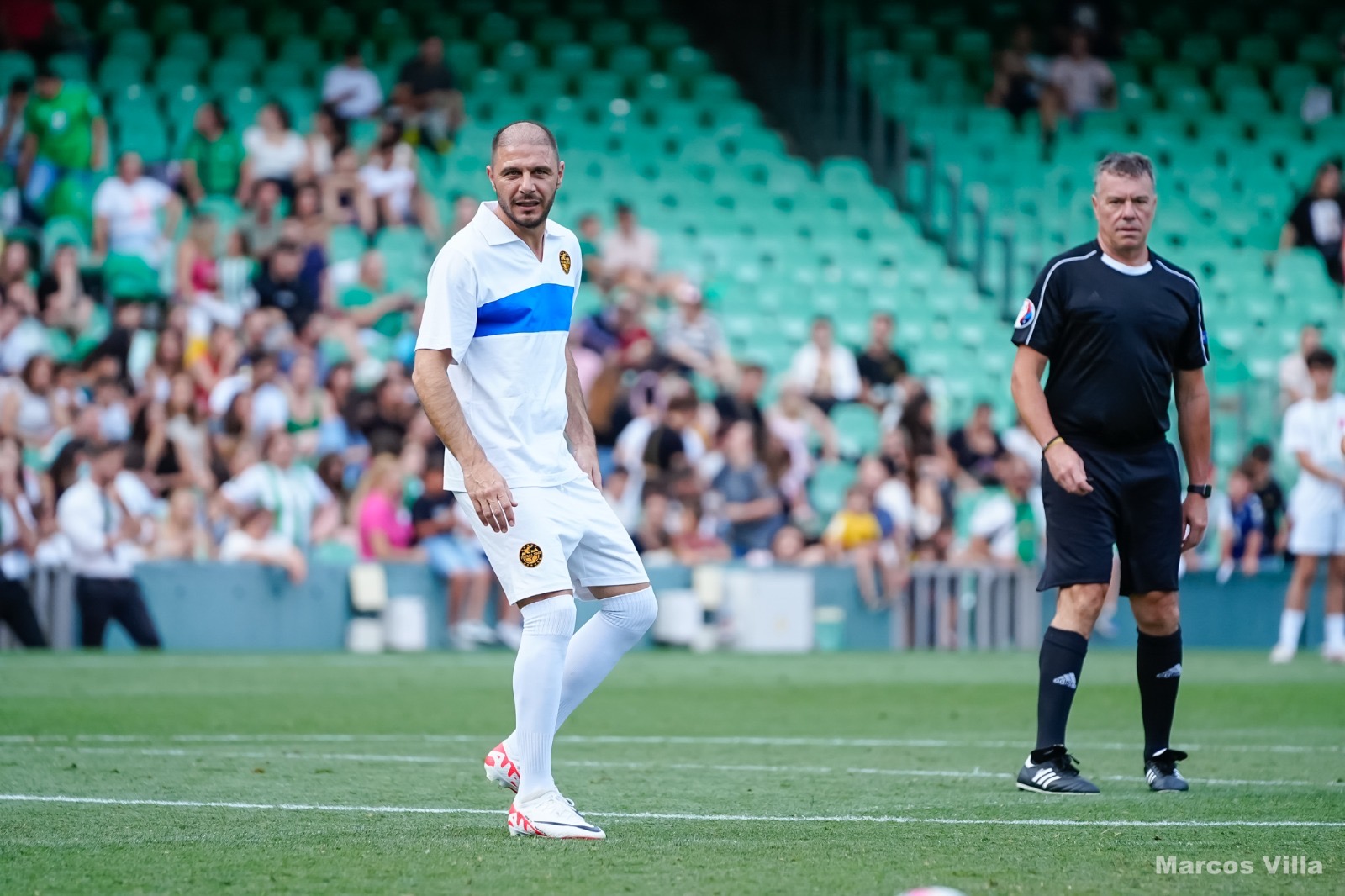 Joaquín volvía al césped del templo verdiblanco un año después de su retirada y se mostraba “feliz de volver a estar aquí, y volver a pisar este campo”. Enfrente, el combinado de cantantes, comandado por Rafa Almarcha, contaba con cantantes de la talla de Demarco, Juanlu Montoya, Jaime Soto, Antonio José, Arcángel o Paco Candela, líder futbolístico del equipo de artistas que no pudo evitar la derrota ante los exfutbolistas.