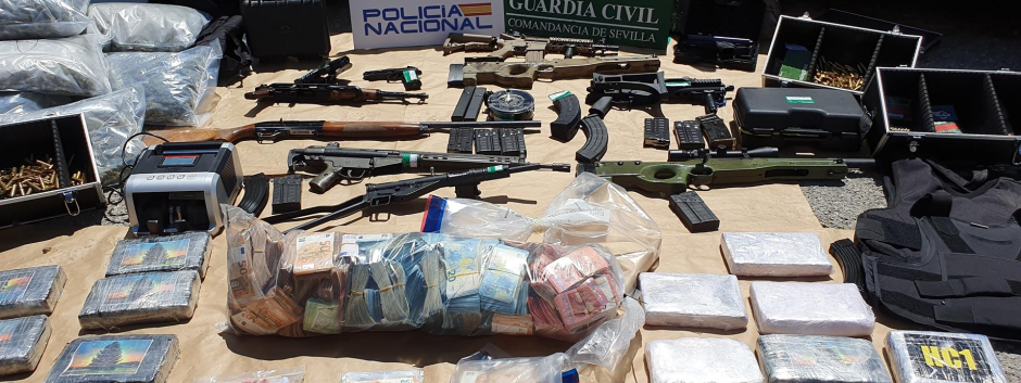 En estos registros se ha decomisado medio millón de euros en billetes de diverso valor y se han intervenido 38 kilogramos de cocaína, 54 kilos de marihuana envasadas al vacío, un kilo de tusi (cocaína rosa), más de medio kilo de metanfetaminas, 12 kilos de hachís, tres armas de guerra ―un cetme LC, un kalasthnikov y un subfusil ametrallados―, dos armas largas robadas y una pistola de nueve milímetros con silenciador.