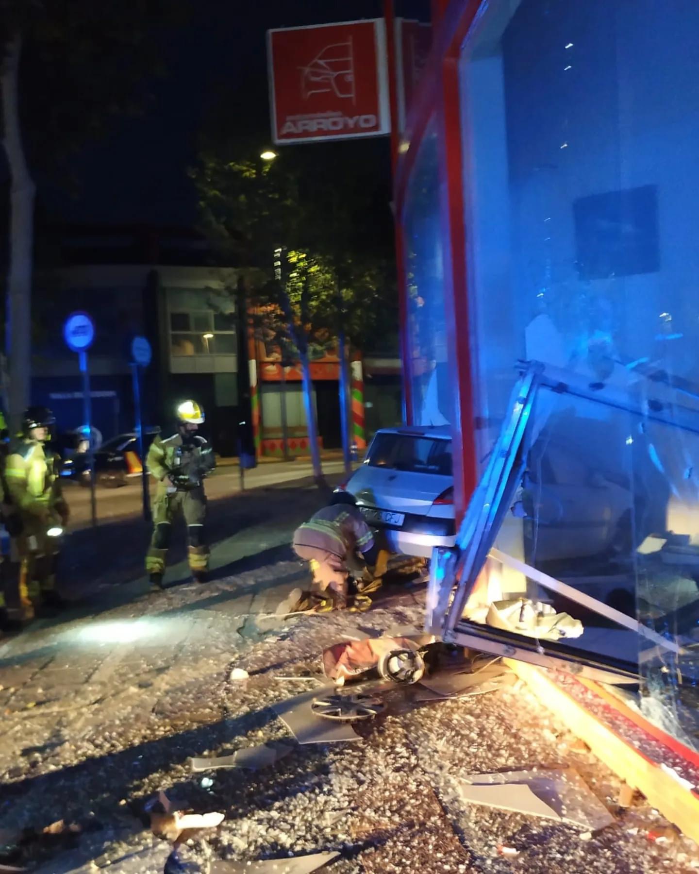 Sobre las 3 de la madrugada se oía un fuerte estruendo y numerosos curiosos se acercaban al ver la imagen. Un coche incrustado contra una cristalera de un concesionario. Además el coche accidentado salió ardiendo por lo que tuvieron que acudir efectivos de Bomberos.