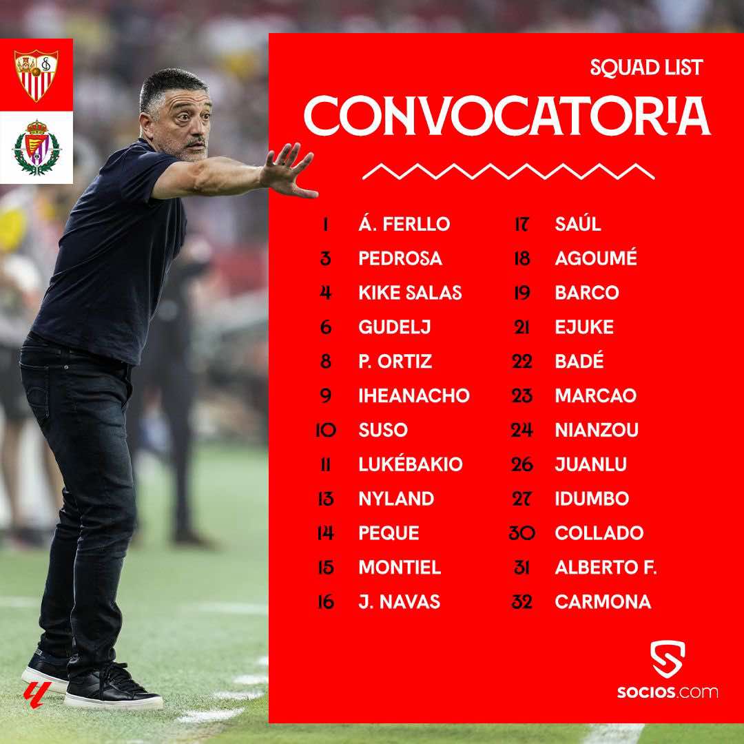 Nyland, Álvaro Ferllo, Alberto Flores, Carmona, Montiel, Jesús Navas, Juanlu, Pedrosa, Barco, Badé, Marcao, Nianzou, Kike Salas, Gudelj, Agoumé, Saúl, Pedro Ortiz, Suso, Peque, Collado, Idumbo, Lukebakio, Ejuke e Iheanacho.