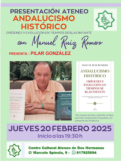 El jueves 20 de febrero, la Asociación Cultural Ateneo de Dos Hermanas tendrá el privilegio de contar con D. Manuel Ruiz Romero, uno de los grandes estudiosos de la vida y la obra del padre de la patria andaluza, para presentarnos su último libro: Andalucismo histórico. Orígenes y evolución en tiempos de Blas Infante. El evento está enmarcado en las actividades en torno al 28F, será presentado por Pilar González, licenciada en Historia, y ex-senadora andaluza, y se celebrará a las 19:30h en los locales del Centro Cultural (Marcelo Spínola, 9). Entrada libre hasta completar aforo.
