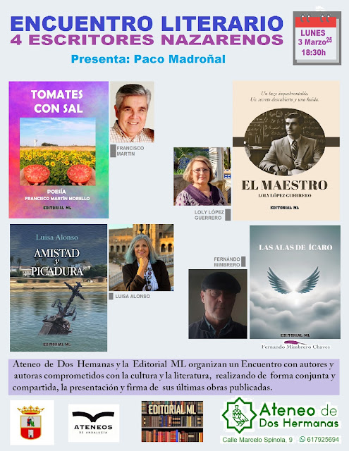 El próximo lunes 3 de marzo Ateneo de Dos Hermanas, con la colaboración de Editorial ML organizan un Encuentro Literario de 4 escritores, comprometidos con la Cultura y la Literatura, realizando de forma conjunta y compartida la presentación y firmas de sus últimas obras publicadas. En esta ocasión tendremos el privilegio de contar con Francisco Martín Morello, Loly López Guerrero, Luisa Alonso Reguera y Fernando Mimbrero Chaves.