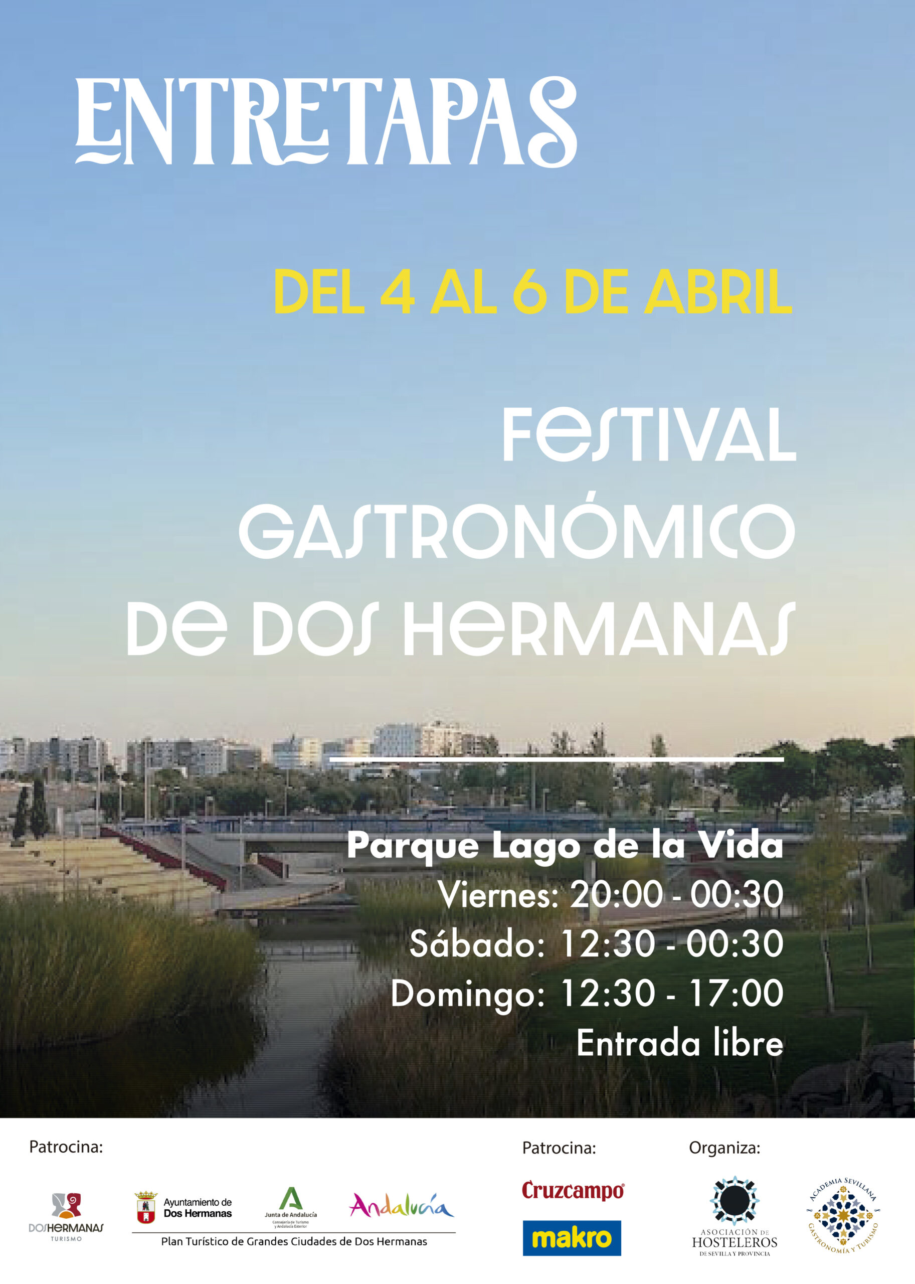 Dos Hermanas acogerá del 4 al 6 de abril en el Parque Lago de la Vida (Entrenúcleos) un festival gastronómico de la mano de la Academia Sevillana de Gastronomía y Turismo y la Asociación de Hostelería de Sevilla y Provincia, y patrocinado por el Ayuntamiento de Dos Hermanas en el marco del Plan de Turismo de Grandes Ciudades de Dos Hermanas.