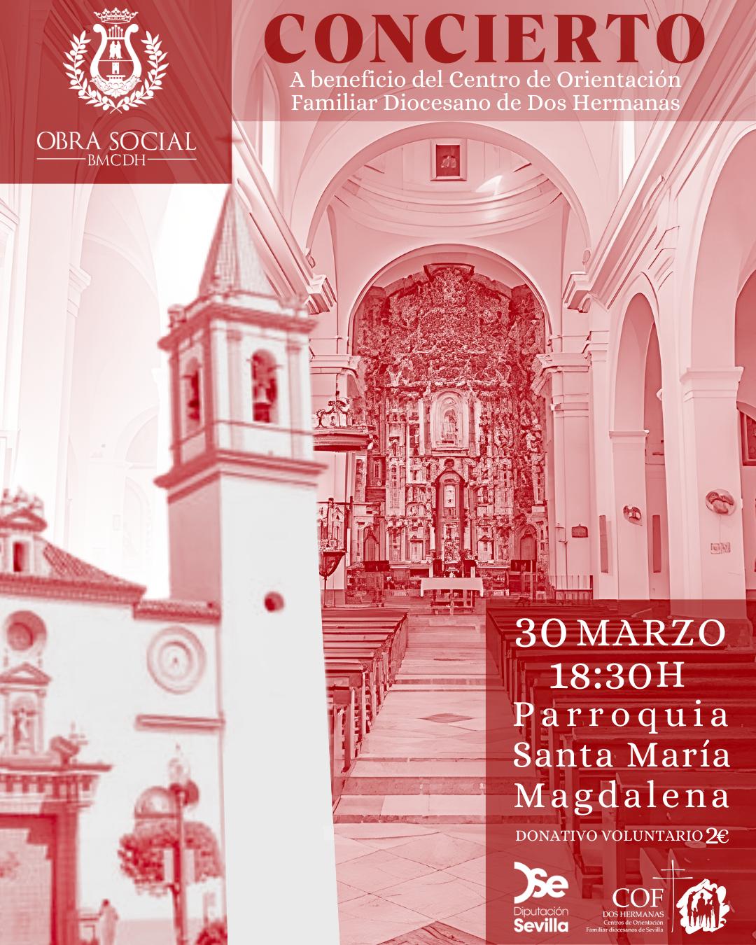 La Banda de Música Ciudad de Dos Hermanas ofrecerá el próximo domingo 30 de marzo (18.30) un concierto en la Parroquia de Santa María Magdalena a beneficio del Centro de Orientación Familiar de Dos Hermanas.
