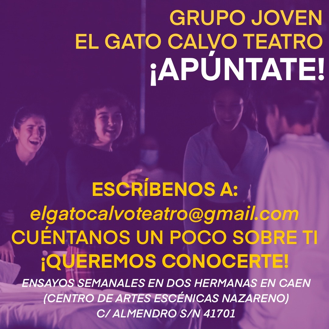El Gato Calvo Teatro ha lanzado una convocatoria para formar un grupo juvenil en Dos Hermanas, se trata de un proyecto gratuito, dirigido a adolescentes con inquietudes artísticas, que deseen explorar el teatro como herramienta de expresión, crecimiento personal y trabajo en equipo.