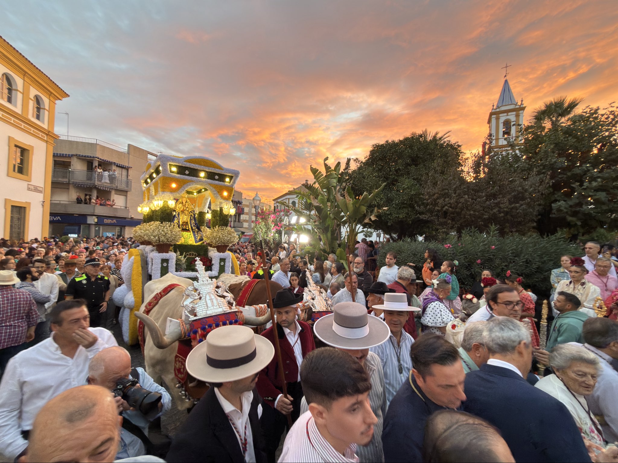 La Virgen, ataviada con su manto de terciopelo azul bordado en oro, fue acompañada por una larga comitiva de carretas, caballistas y carretillas, además de centenares de romeros que, entre rezos, cantos y vivas, avanzaron por la carretera vieja hacia Bellavista. A lo largo del trayecto, la imagen fue recibida por miles de fieles que aguardaban su paso con emoción y respeto.