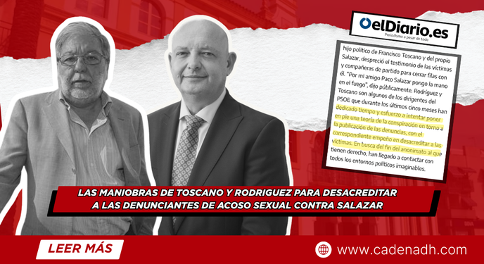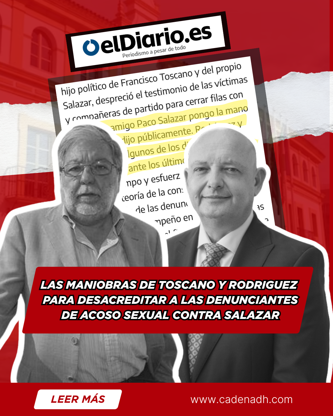 El reportaje detalla que la influencia de Toscano, histórico exalcalde de Dos Hermanas y figura de enorme peso interno, no ha desaparecido tras su retirada institucional. Muy al contrario: continúa actuando como uno de los principales respaldos de Salazar, contribuyendo —según la información citada— a la construcción de una teoría de la conspiración destinada a deslegitimar las denuncias y sembrar dudas sobre las víctimas.
