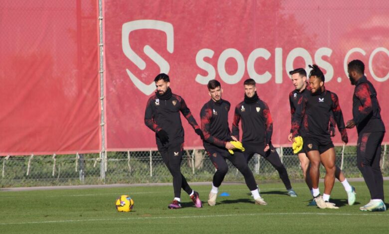 Nuevo entrenamiento de Sevilla FC que prepara el partido ante el RCD Espanyol el próximo sábado en el Estadio Ramón Sánchez-Pizjuán.